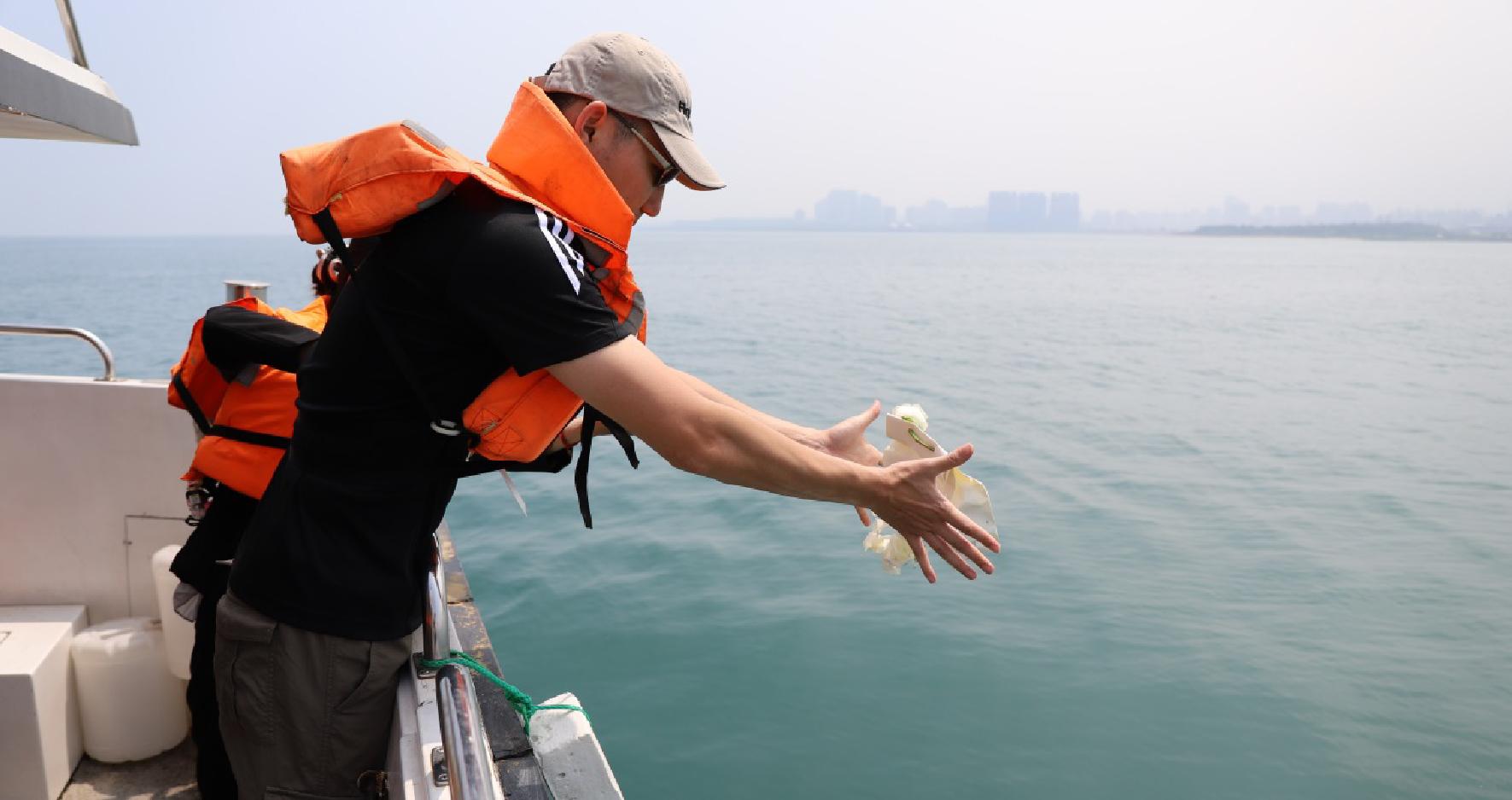 再將「環保容器」伴隨鮮花拋向海中,於家人默禱下目送骨灰沉入海中。